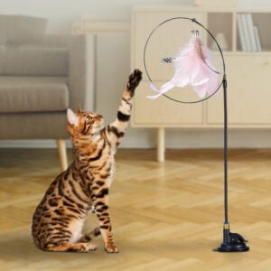 Suction cup-teasing cat stick with feather, ribbon, and bell